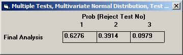 procedure of the means from a multivariate normal distribution. In a clinical outcome trial one of the objectives was to test if the addition of a new drug on top of standard treatment would benefit patients with acute coronary syndrom (ACS). The plan was to study the time to a non-fatal myocardial infarction, to a non-fatal stroke, and to a re-vascularisation. Each time would be recorded and analysed separately with a log-rank test. Since the occurrence of these events would depend on each other, the separate log-rank tests have to be treated as dependant tests. The log-rank test can be approximated for large sample sizes with a test based on the logarithm of the estimated hazard ratio, i.e. log (estimated HR) is normally distributed with a mean log(HR) and a variance 1 / Es + 1 / En, where Es and En are the expected number of events in the standard and new drug group, respectively. Hence it could be assumed that that the three estimated log(HR)’s followed a multivariate normal distribution with a correlation matrix as described above. The three null-hypotheses to be tested were H0: HR = 1 for each of non-fatal MI, non-fatal stroke, and re-vascularisation. It was considered important to detect a 20% lower risk for each of the three hypotheses, H1: HR = 0.8, and to control the family-wise error rate at 5%. From previous trials it was found that the correlation coefficient between the estimated log(HR) for non-fatal myocardial infarction and non-fatal stroke could be assumed to be approximately 0.4. Similarly, the corresponding correlation coefficient between non-fatal myocardial infarction and re-vascularisation and between non-fatal stroke and re-vascularisation was 0.3 and 0.2, respectively The size of the trial had been calculated for the primary variable, the composite variable time to first event of non-fatal MI, non-fatal stroke, or re-vascularisation. With 90% power it turned out that 860 events were needed. It was assumed that the proportion of events should approximately be distributed as 50%, 40%, and 10%. The expected number of the three event types would then be approximately 430, 344, and 86. Under H1: HR =0.8, these should in turn be distributed as (239, 191), (191, 153), and (48, 38), respectively, for (new drug, standard). Using the formulas above for the variance, the three standard deviations could be calculated to 0.097, 0.108, and 0.217. To calculate the chance to detect at least one of the risk reductions Open