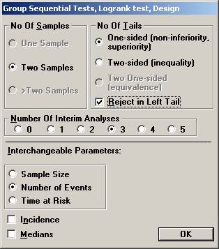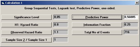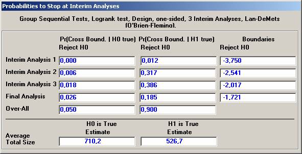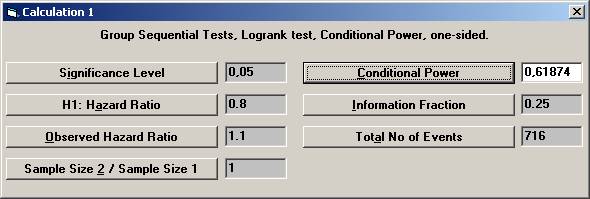 design with conditional- and predictive power for a logrank test. An outcome study was planned to show that a newly approved cardiovascular drug was more effective in preventing cardiovascular events than a competitor drug which had been on the market for a long time. The intention was to use the time to the first occurrence of one of the three cardiovascular events, non-fatal myocardial infarction (MI), non-fatal stroke, and cardiovascular death, as the primary variable. It turned out that the number of events needed to significantly show a relative risk reduction of 20% with 90% power was approximately 700 using a one-sided log-rank test at a 5% significance level. Since it was thought from a market perspective that the study duration would be too long to collect 700 events, a group sequential design was proposed. The idea was to perform 3 interim analysis, after approximately 25%, 50%, and 75% of the total events needed, and hoping that one of the interim analyses would show a significantly better effect for the new drug and then stop the study.. To calculate the maximum number of events needed using a Lan-DeMets(O’Brien-Fleming) approach for calculating the significance levels at each interim analysis Open
