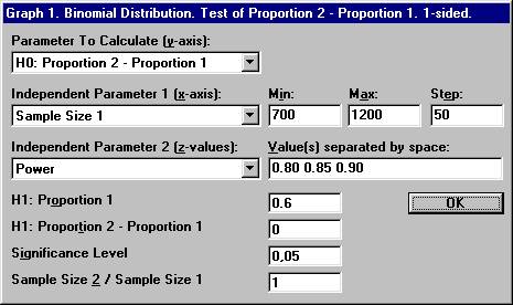 proportions A clinical trial is planned to compare the effect of a new treatment with the existing treatment. The plan is to show that the new treatment is clinically at least as good as the existing. Since the new treatment is thought to have fewer adverse events, it is considered sufficient to show that the true percentage of patients responding to the new treatment is not less than 5% compared to the old one. From previous experience one knows that the percentage of responders with the existing treatment is approximately 60%. The study will be a randomized double blind parallel group study with equal number of patients in the two groups. The objective is to conclude that the true percentage of responders with the new treatment is at most 5% less than for the existing. Thus the difference in percentage of responders, the new treatment minus the existing treatment, should be greater than - 5%. If this is the case, the new treatment is considered as non-inferior to the existing treatment with respect to the percentage of responders. The intention is to perform a one-sided test based on the binomial distribution and conclude that the new treatment is non-inferior if the calculated one-sided p-value is less than 0.05 (significance level), i.e. a statistical significant result. Moreover, if the true difference between the new treatment and the old treatment is exactly 0%, then the test should give a p-value less than 0.05 with a probability of 0.80. In other words, we should conclude non-inferiority with a probability of 0.80 (power). Since we want to conclude that the difference in responders, new treatment minus existing treatment, is greater than - 5%, we choose as the null hypothesis H0: the true difference in proportions is less than or equal to - 0.05 and the alternative hypothesis H1: the true difference in proportions is greater than - 0.05. The null hypothesis is rejected if the calculated difference in proportions is large enough.