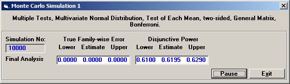 the File menu and choose New Monte Carlo Simulation.  Set options Two-sided, no interim analysis, Disjunctive Power, and General Covariance Matrix and click OK.